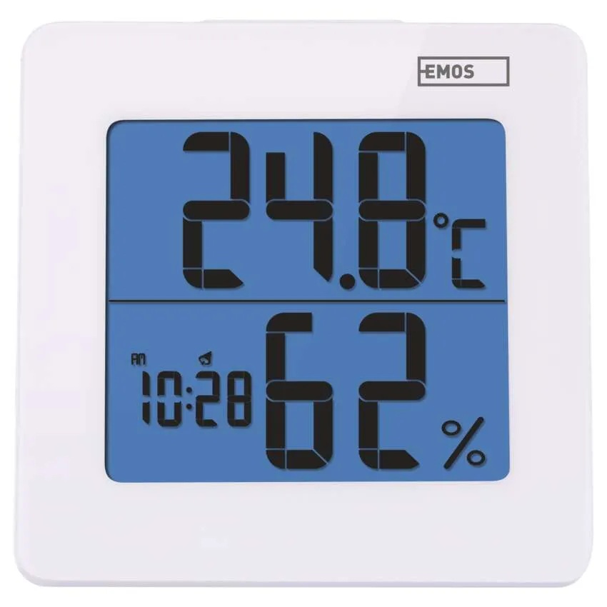 Teploměr v bílé barvě s hodinami řízenými Quarz krystalem. Teploměr má podsvícení displeje, zobrazuje vnitřní teplotu a vlhkost, hodiny, datum a má budík.