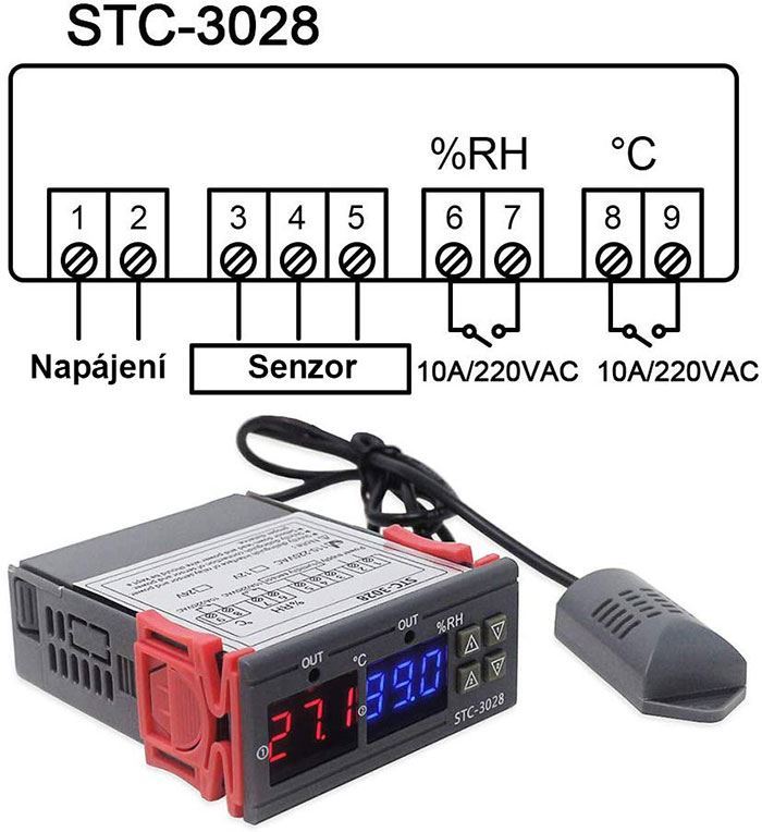 STC-3028 je termostat s hygrostatem, který dokáže regulovat vlhkost i teplotu současně na rozděleném displeji.STC-3028 má dvě samostatné spínací relé – výstup termostatu + výstup hygrostatu. Kombinovaný termostat a hygrostat dokáže ohřívat / chladit, zvlhčovat nebo odvlhčovat. najde využití v líhních, teráriu a všude tam kde je nutno regulovat teplotu a vlhkost.