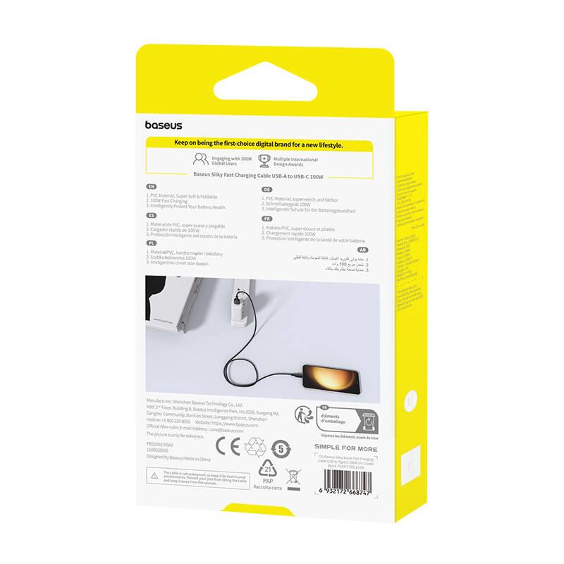 Baseus Silky je měkký a odolný nabíjecí kabel s podporou 100W Power Delivery (PD), ideální pro rychlé nabíjení iPhonu a dalších kompatibilních zařízení. Je vyroben z pružného PVC materiálu a odolný vůči ohýbání a lámání, což prodlužuje jeho životnost.