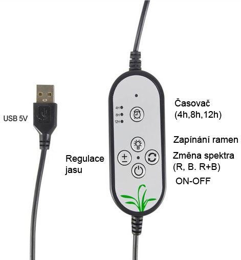 LED lampa s barevným spektrem 400–840nm vhodná pro pěstování rostlin. Speciální LED podporují fotosyntézu rostlin, takže mohou nahradit sluneční světlo. Ramena lampy jsou flexibilní a lze je nasměrovat nad rostliny, aby byl účinek co nejvyšší.